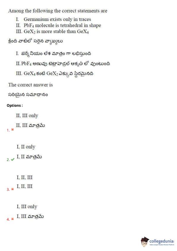 Thus, the correct answer is option (1) Statements I, II are correct. Quick Tip: In electrophilic substitution reactions, the presence of electron-donating or electron-withdrawing groups on the aromatic ring influences the reactivity and the position of substitution.