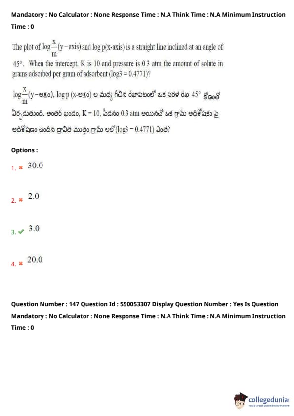 Thus, the correct answer is 3.0. Quick Tip: For problems involving adsorptive properties, utilize the equation for the straight line plot of \( \log \frac{x}{m} \) vs \( \log p(x) \), and substitute the given values to solve for the unknowns.