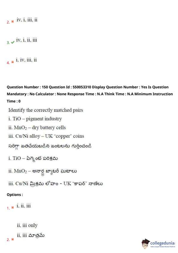 Thus, the correct matching pairs are (i) and (ii), making option (3) the correct answer. Quick Tip: When dealing with industrial uses of chemicals or alloys, make sure to focus on common applications in consumer products or industry standards.