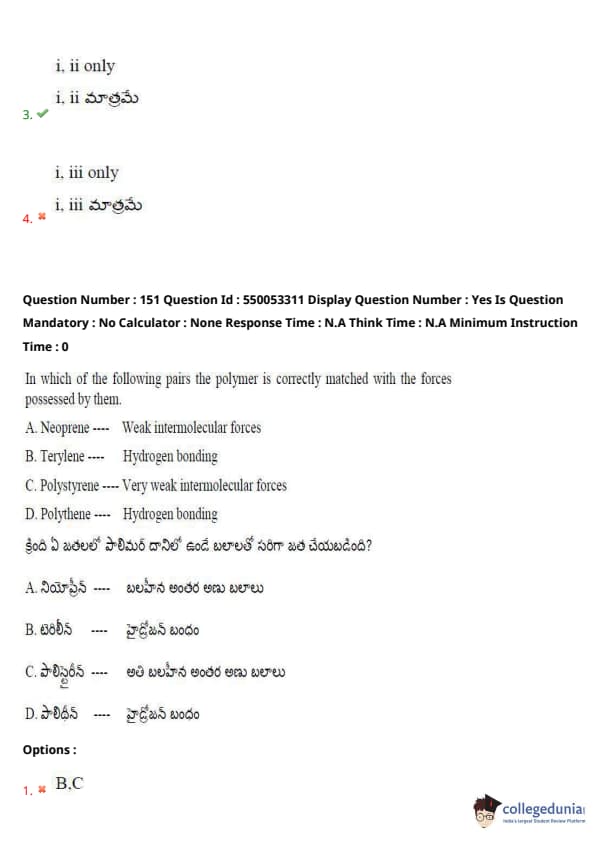 Thus, the correct pairs are option (3) A, B. Quick Tip: When studying polymers, pay close attention to their molecular structure and the types of bonding they exhibit, as this influences their mechanical properties and applications.