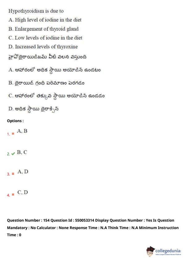 Thus, the correct answer is option (2) B, C. Quick Tip: Ensure adequate iodine intake in the diet to maintain normal thyroid function. Deficiency can lead to hypothyroidism and other health issues.