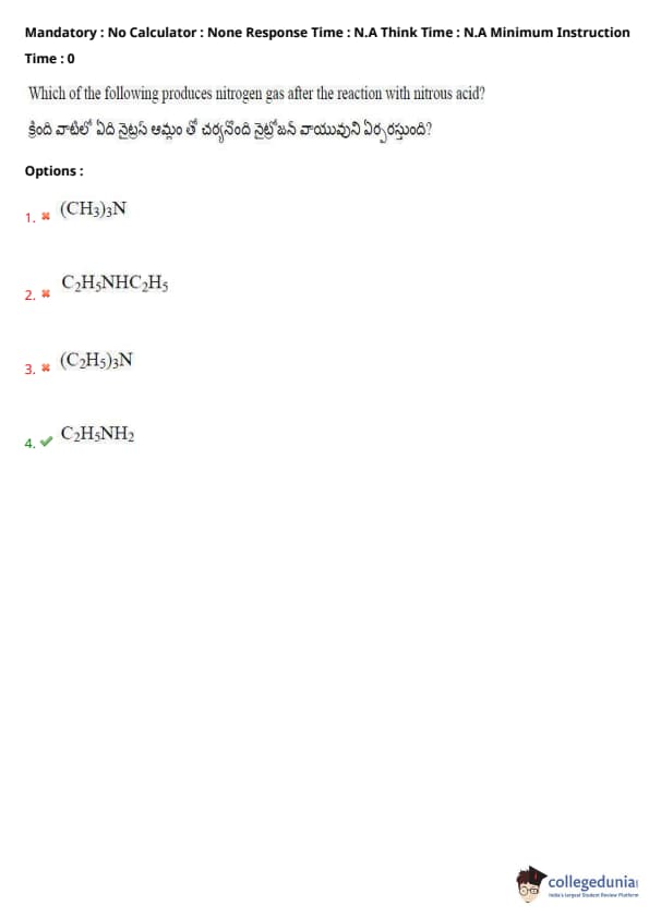 Thus, the correct answer is option (4). Quick Tip: When an amine reacts with nitrous acid, it generally leads to the evolution of nitrogen gas, especially for primary amines like \( C_2 H_5 NH_2 \).