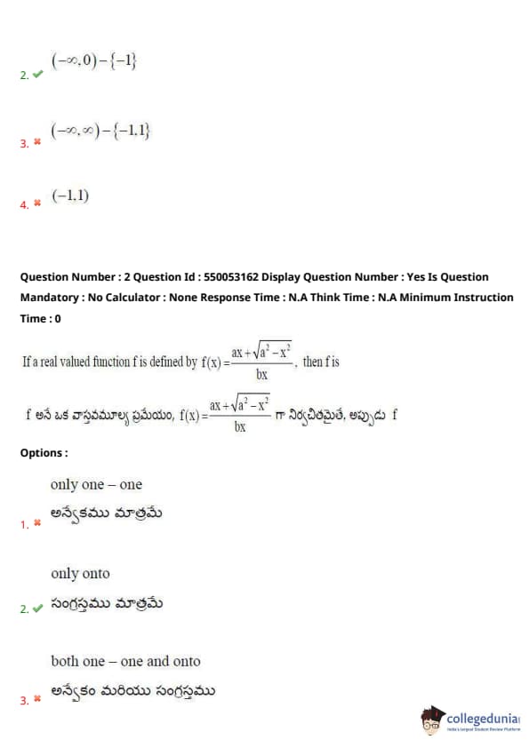 Hence, \( f(x) \) sweeps all values in \( \mathbb{R} \), depending on \( x \)'s sign and proximity to 0, making it onto. Quick Tip: Always examine domain restrictions carefully when roots and denominators are involved. Use boundary analysis and symmetry to test injectivity and surjectivity.