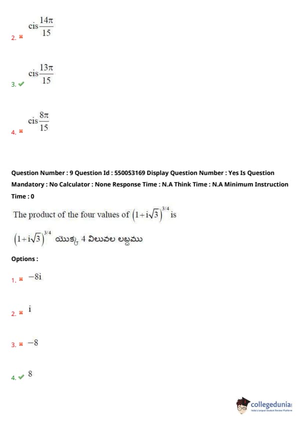 Thus, the correct answer is \( cis \frac{13\pi}{15} \), which corresponds to option (3). Quick Tip: To find the \( n \)-th roots of a complex number, use the formula \( z_k = cis \left( \frac{\theta + 2k\pi}{n} \right) \) and substitute appropriate values of \( k \).