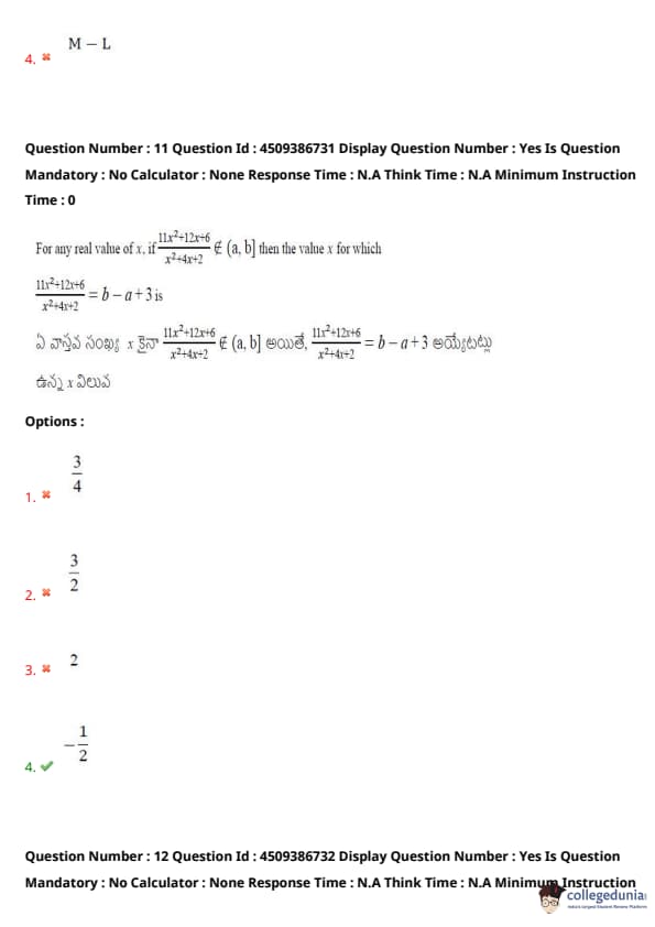 For any real value of \(x\), if \( \frac{11x^{2}+12x+6}{x^{2}+4x+2} \not\in (a, b) \), then the value for \(x\) for which \[ \frac{11x^{2}+12x+6}{x^{2}+4x+2} = b - a + 3 \]
