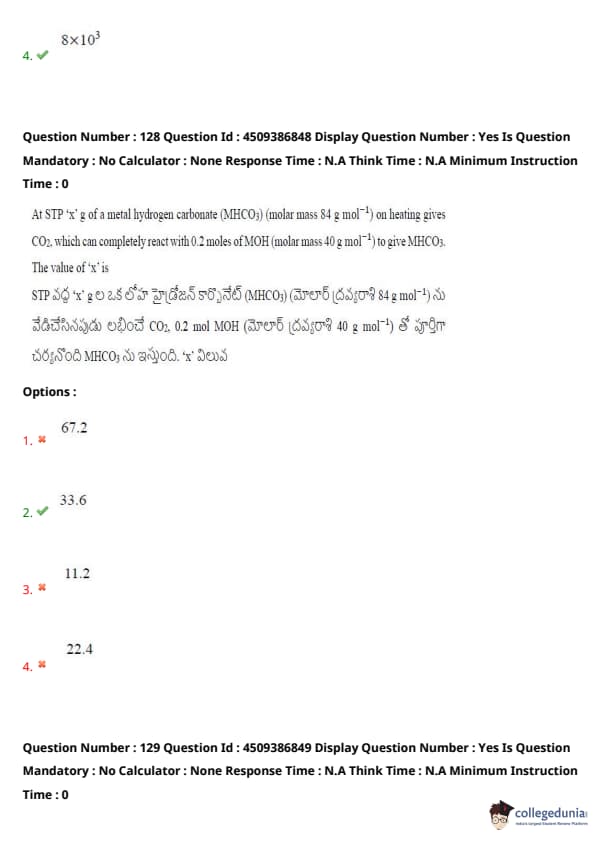 At STP \(x\) g of a metal hydrogen carbonate (MHCO\(_3\)) (molar mass \(84 \, g/mol\)) on heating gives CO\(_2\), which can completely react with \(0.02 \, moles\) of MOH (molar mass \(40 \, g/mol\)) to give MHCO\(_3\). The value of \(x\) is: