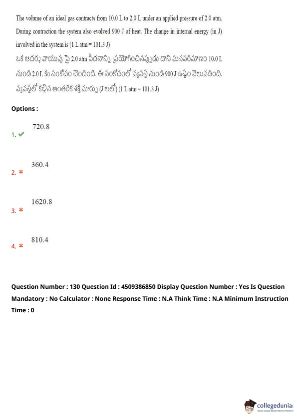 The volume of an ideal gas contracts from 10.0 L to 2.0 L under an applied pressure of 2.0 atm. During contraction, the system also evolved 90 J of heat. The change in internal energy (in J) involved in the system is (1 L·atm = 101.3 J):