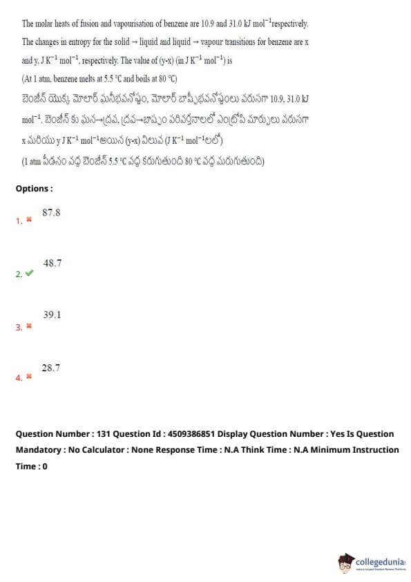 The molar heats of fusion and vaporization of benzene are 10.9 and 31.0 kJ mol\(^{-1}\) respectively. The changes in entropy for the solid \(\rightarrow\) liquid and liquid \(\rightarrow\) vapor transitions for benzene are \(x\) and \(y\) J K\(^{-1}\) mol\(^{-1}\) respectively. The value of \(y(x)\) in J\(^2\) K\(^{-2}\) mol\(^{-2}\) is: