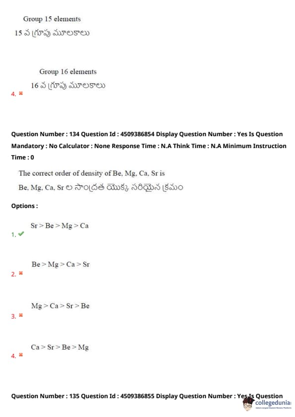 The correct order of density of Be, Mg, Ca, Sr is: