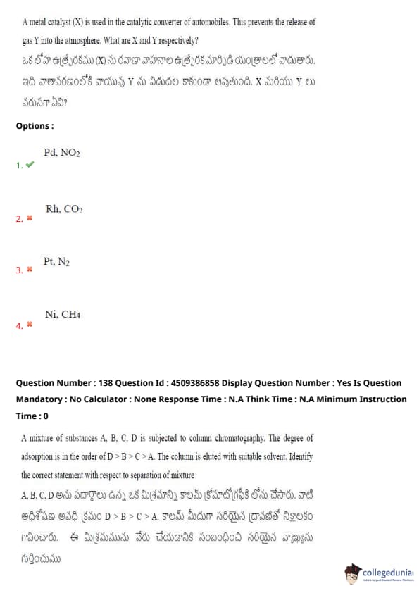 A metal catalyst (X) is used in the catalytic converter of automobiles. This prevents the release of gas Y into the atmosphere. What are X and Y respectively?