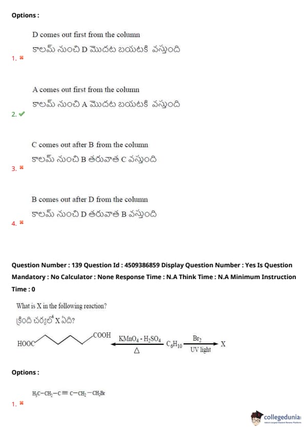 A mixture of substances A, B, C, D is subjected to column chromatography. The degree of adsorption is in the order of \(D > B > C > A\). The column is eluted with a suitable solvent. Identify the correct statement with respect to the separation of the mixture.