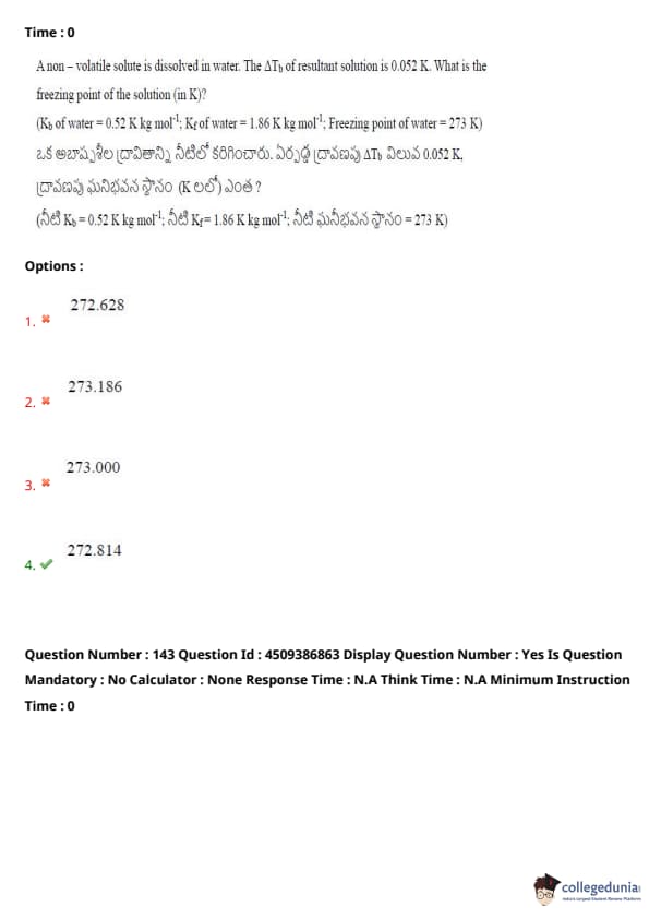 (Given: \( K_b \) of water = 0.52 K kg mol\(^{-1}\), \( K_f \) of water = 1.86 K kg mol\(^{-1}\), Freezing point of water = 273 K)