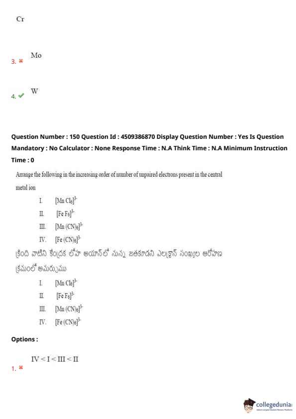 Arrange the following in the increasing order of number of unpaired electrons present in the central metal ion:
