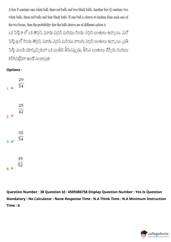 A box \( P \) contains one white ball, three red balls and two black balls. Another box \( Q \) contains two white balls, three red balls and four black balls. If one ball is drawn at random from each one of the two boxes, then the probability that the balls drawn are of different color is