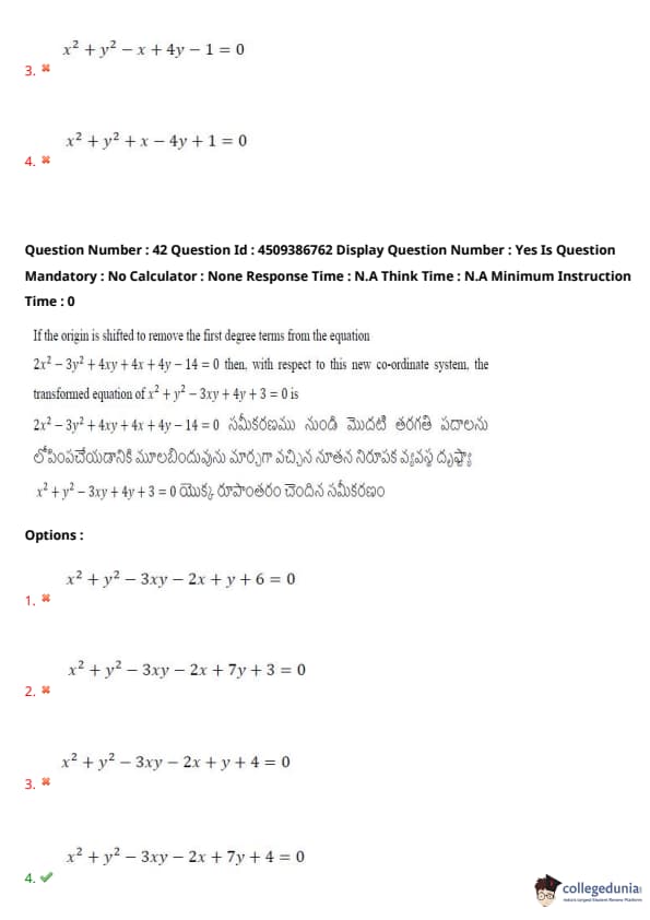If the origin is shifted to remove the first degree terms from the equation \(2x^2 - 3y^2 + 4xy + 4x + 4y - 14 = 0\), then with respect to this new co-ordinate system, the transformed equation of \(x^2 + y^2 - 3xy + 4y + 3 = 0\) is