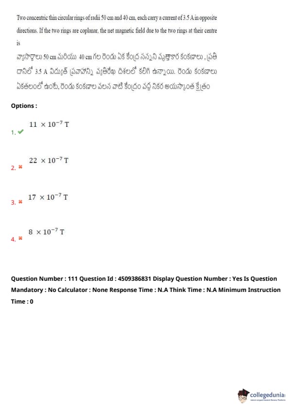Two concentric thin circular rings of radii 50 cm and 40 cm each, carry a current of 3.5 A in opposite directions. If the two rings are coplanar, the net magnetic field due to the two rings at their centre is: