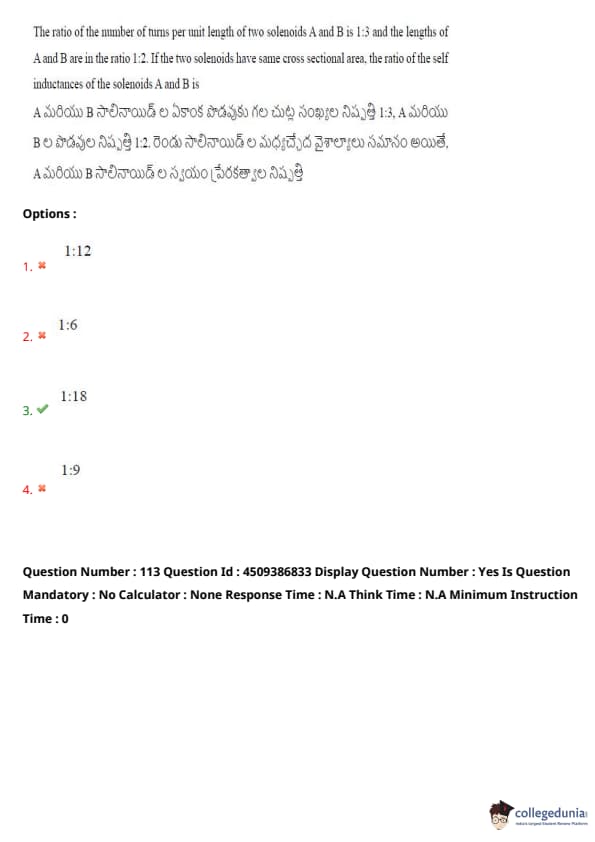 The ratio of the number of turns per unit length of two solenoids A and B is \(1:3\) and the lengths of A and B are in the ratio \(1:2\). If the two solenoids have the same cross-sectional area, the ratio of the self-inductances of the solenoids A and B is: