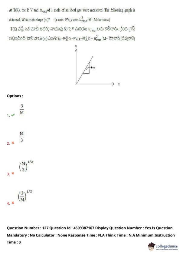 At \( T(K) \), the \( P, V \) and \( u_{rms} \) of 1 mole of an ideal gas were measured. The following graph is obtained. What is its slope (\( m \))? (x-axis = \( PV \); y-axis = \( u_{rms}^2 \); \( M \) = Molar mass)