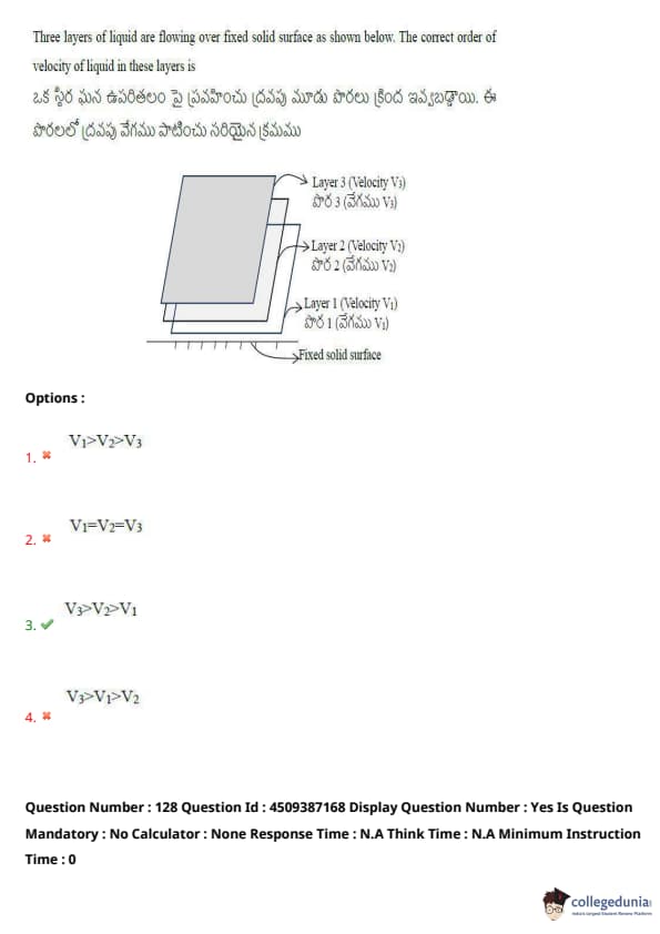 Three layers of liquid are flowing over a fixed solid surface as shown below. The correct order of velocity of liquid in these layers is: