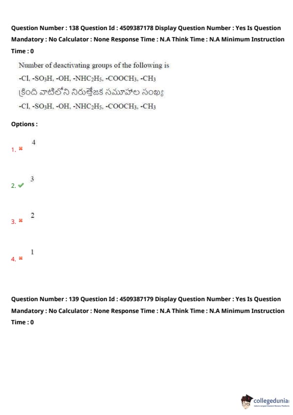 Number of deactivating groups among: \( -Cl, -SO_3H, -OH, -NHC_2H_5, -COOCH_3, -CH_3 \)