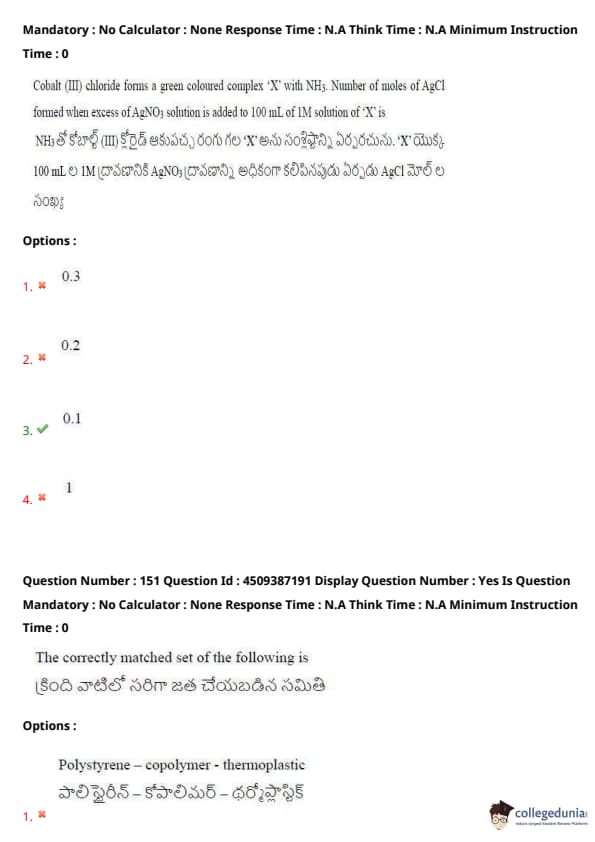 Cobalt (III) chloride forms a green-colored complex ‘X’ with NH\(_3\). Number of moles of AgCl formed when excess AgNO\(_3\) solution is added to 100 mL of 1M solution of ‘X’ is: