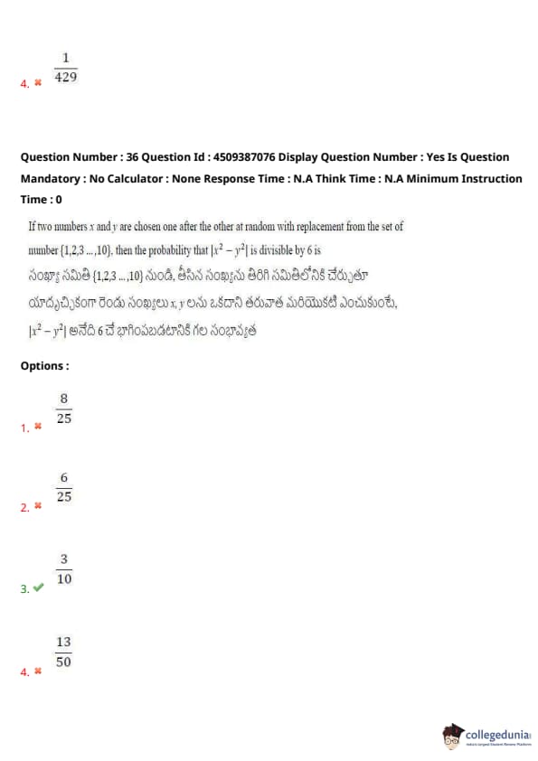 If two numbers \(x\) and \(y\) are chosen one after the other at random with replacement from the set of numbers \( \{1, 2, 3, \ldots, 10\} \), then the probability that \( |x^2 - y^2| \) is divisible by 6 is: