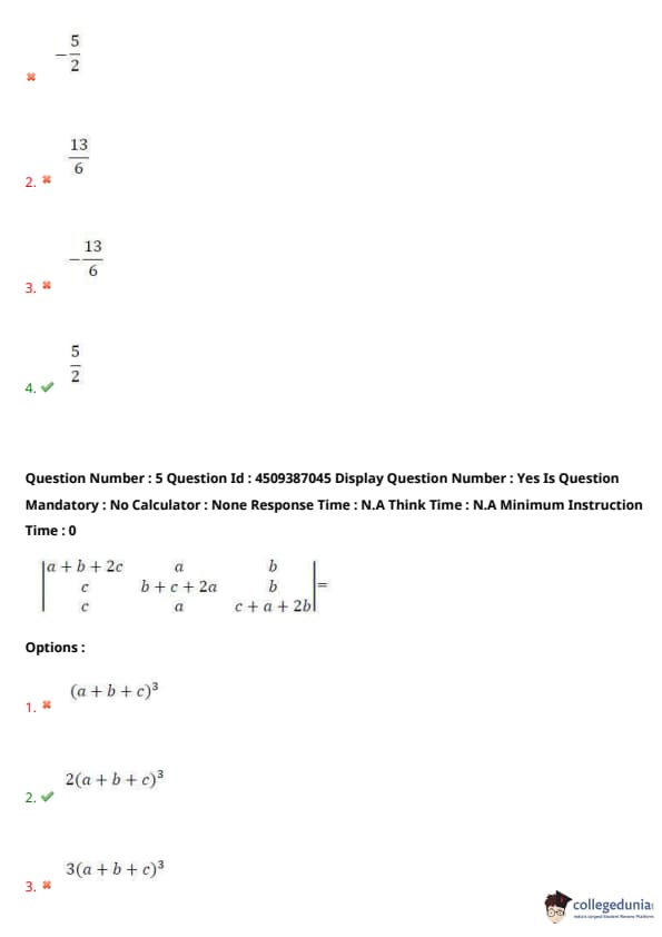 Thus, the value of the determinant is \( 2(a + b + c)^3 \). Quick Tip: For matrix determinants, use cofactor expansion and carefully simplify the 2x2 determinants. After simplifying, check the final expression for patterns like cubes or squares in the terms.