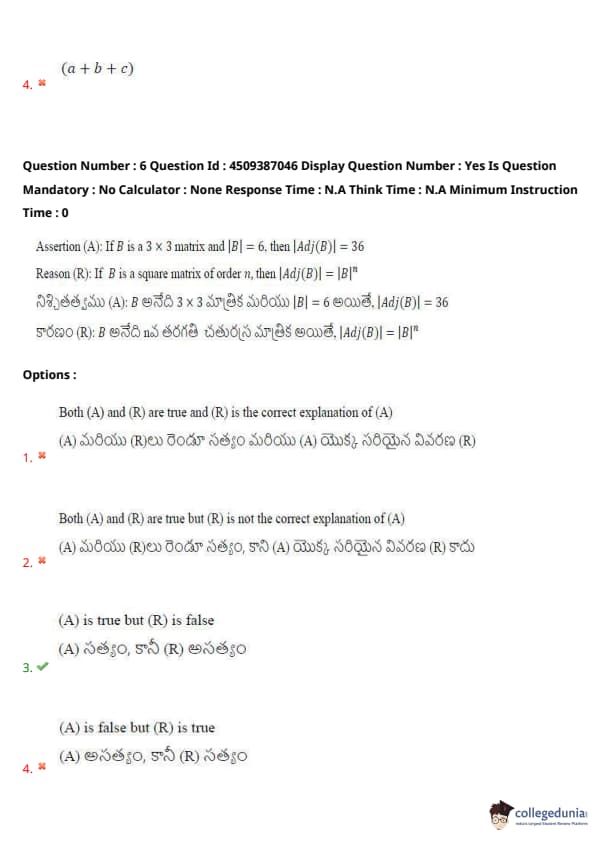 Assertion (A): If \( B \) is a \( 3 \times 3 \) matrix and \( |B| = 6 \), then \( | Adj(B) | = 36 \).