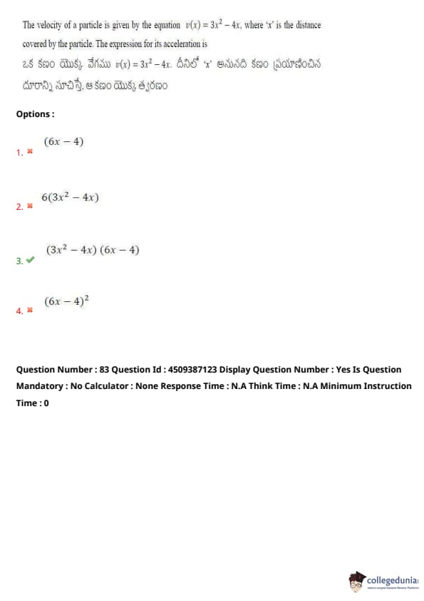 The velocity of a particle is given by the equation \( v(x) = 3x^2 - 4x \), where \( x \) is the distance covered by the particle. The expression for its acceleration is: