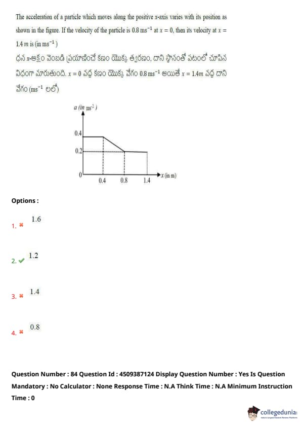 The acceleration of a particle which moves along the positive \( x \)-axis varies with its position as shown in the figure. If the velocity of the particle is \( 0.8 \, m/s \) at \( x = 0 \), then its velocity at \( x = 1.4 \, m \) is: