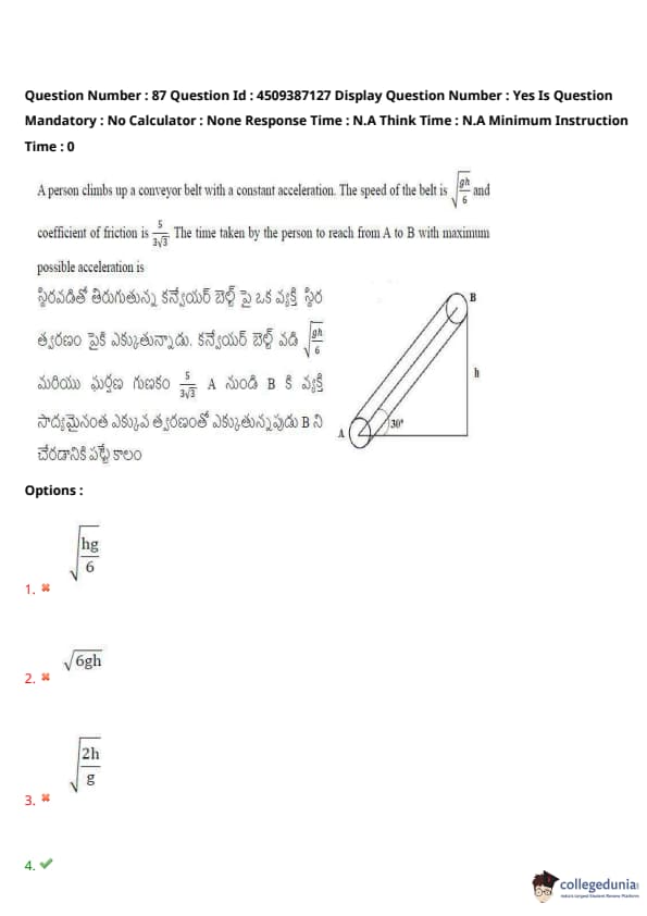 A person climbs up a conveyor belt with a constant acceleration. The speed of the belt is \( \sqrt{\frac{g h}{6}} \) and the coefficient of friction is \( \frac{5}{3\sqrt{3}} \). The time taken by the person to reach from A to B with maximum possible acceleration is: