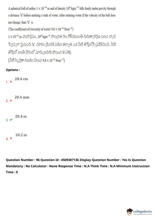 A spherical ball of radius \( 1 \times 10^{-4} \) m and density \( 10^4 \) kgm\(^{-3}\) falls freely under gravity before entering water. The distance \( h \) before velocity change in water is: