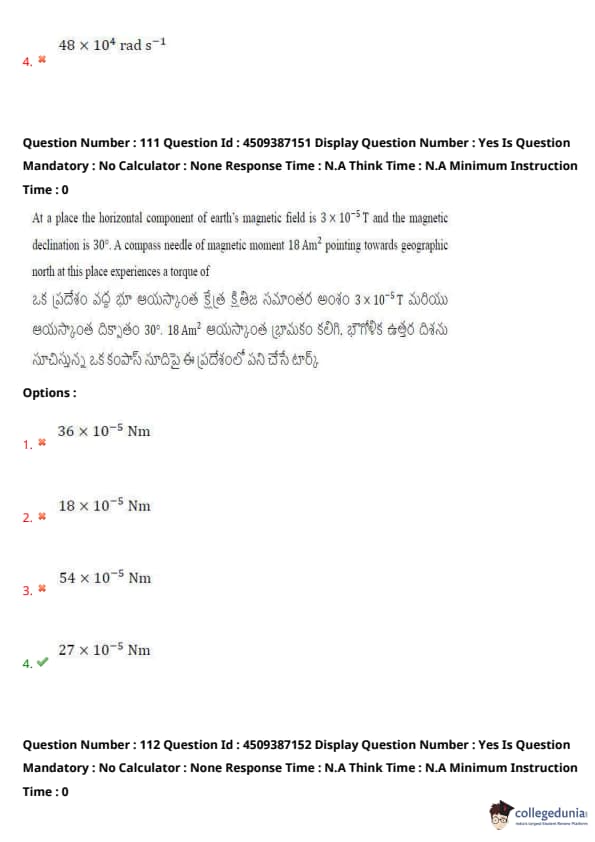 At a place the horizontal component of earth’s magnetic field is \( 3 \times 10^{-5} \) T and the magnetic declination is \( 30^\circ \). A compass needle of magnetic moment \( 18 \) A\(m^2\) pointing towards geographic north at this place experiences a torque of: