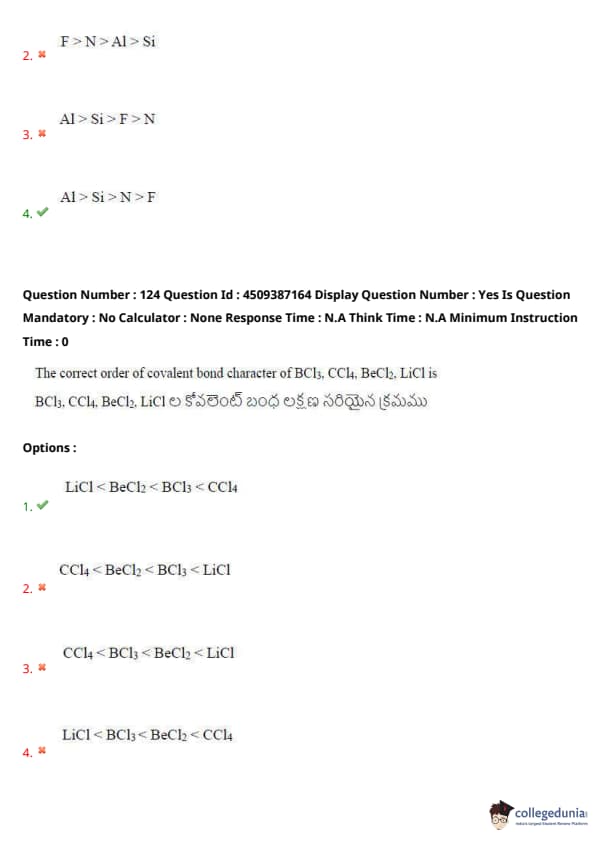 The correct order of covalent bond character of \( BCl_3, CCl_4, BeCl_2, LiCl \) is: