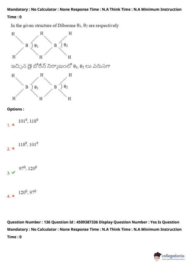 In the given structure of Diborane, \( \theta_1, \theta_2 \) are respectively: