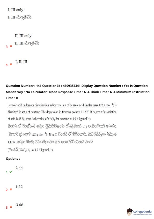 Benzoic acid undergoes dimerization in benzene. \( x \) g of benzoic acid (molar mass 122 g mol\(^{-1}\)) is dissolved in 49 g of benzene. The depression in freezing point is 1.12 K. If degree of association of acid is 88%, what is the value of \( x \)? (K\(_f\) for benzene = 4.9 K kg mol\(^{-1}\))