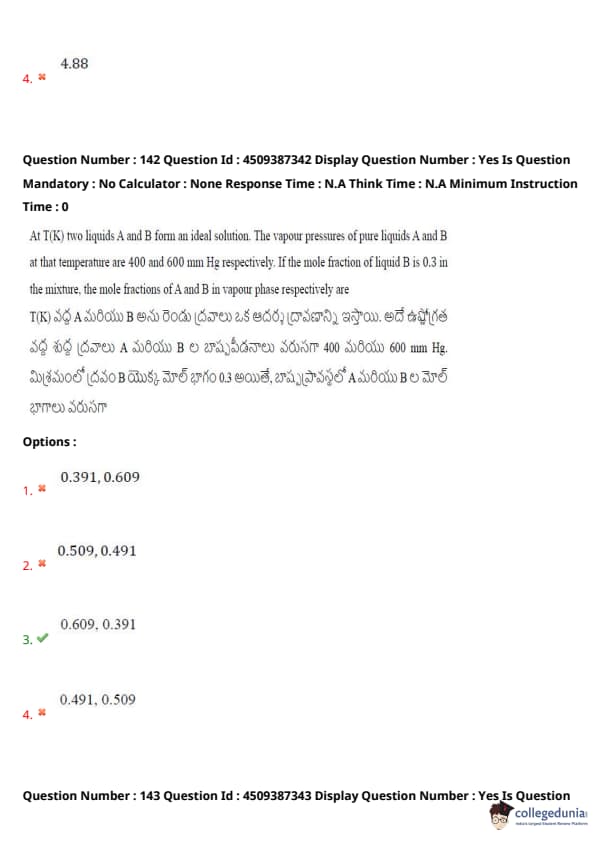 At \( T(K) \), two liquids A and B form an ideal solution. The vapour pressures of pure liquids A and B at that temperature are 400 and 600 mm Hg respectively. If the mole fraction of liquid B is 0.3 in the mixture, the mole fractions of A and B in vapour phase respectively are: