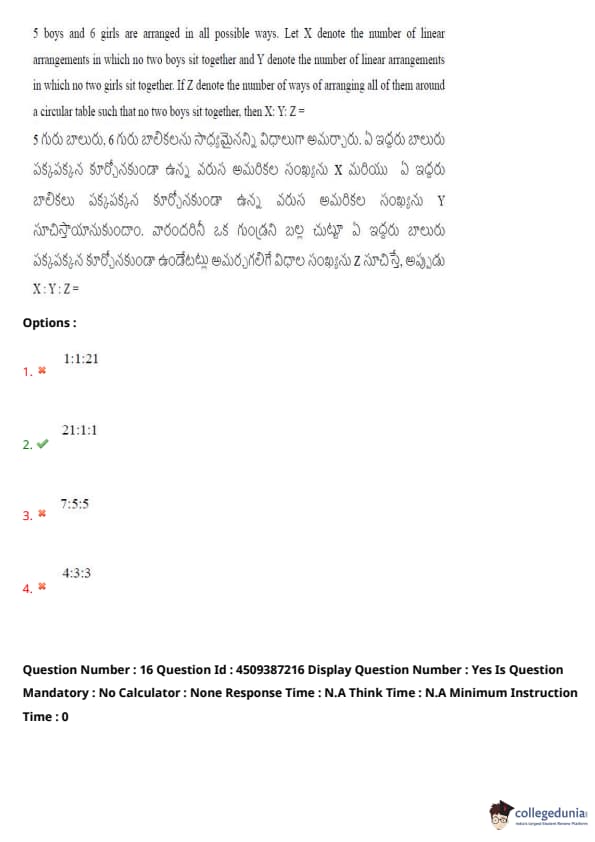 5 boys and 6 girls are arranged in all possible ways. Let \(X\) denote the number of linear arrangements in which no two boys sit together, and \(Y\) denote the number of linear arrangements in which no two girls sit together. If \(Z\) denotes the number of ways of arranging all of them around a circular table such that no two boys sit together, then \(X:Y:Z\) = ?