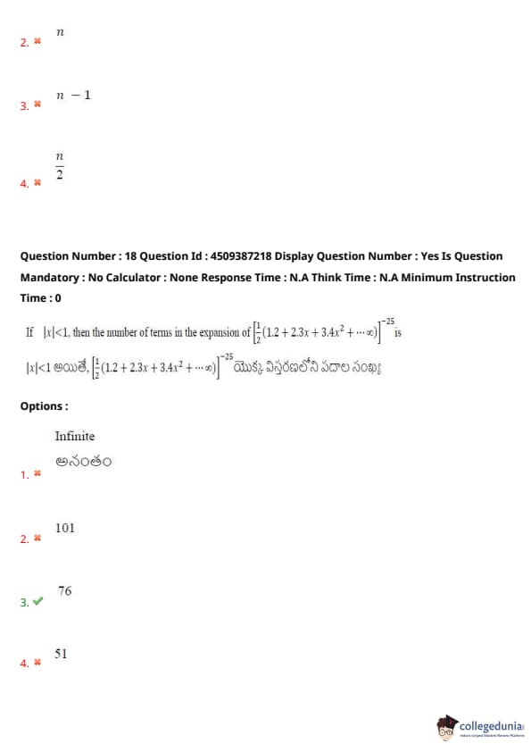 If \( |x| \(<\) 1 \), then the number of terms in the expansion of \( \left[ \frac{1}{2} (1.2 + 2.3x + 3.4x^2 + \dots) \right]^{-25} \) is: