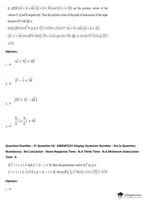 In \( \triangle PQR \), \((4\overline{i} + 3\overline{j} + 6\overline{k} )\) and \((3\overline{i} + \overline{j} + 3\overline{k} )\) are the position vectors of the vertices P, Q, R respectively. Then the position vector of the point of intersection of the angle bisector of \( P \) with \( QR \).