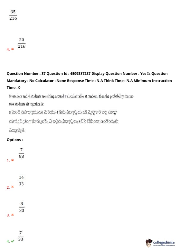 8 teachers and 4 students are sitting around a circular table at random. The probability that no two students sit together is: