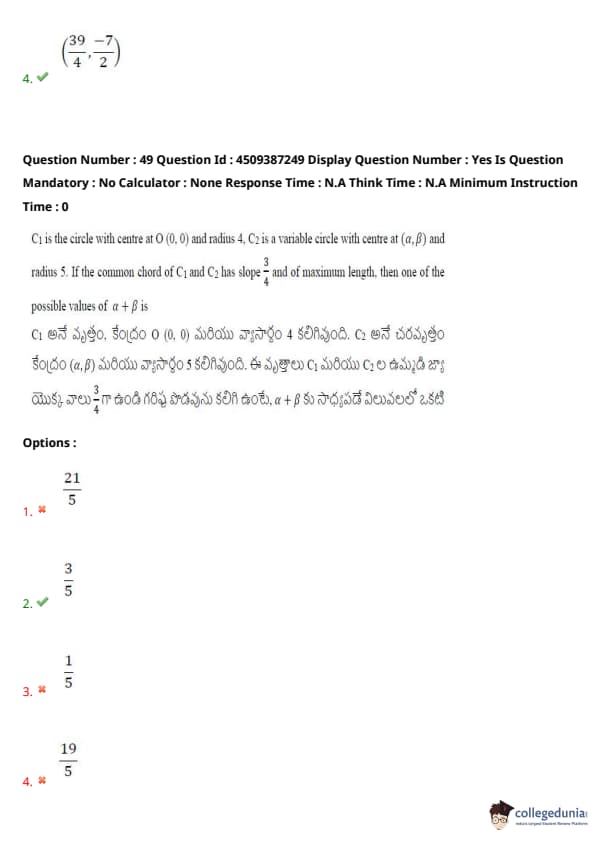 \( C_1 \) is the circle with centre at \( (0,0) \) and radius 4, \( C_2 \) is a variable circle with centre at \( (\alpha, \beta) \) and radius 5. If the common chord of \( C_1 \) and \( C_2 \) has slope \( \frac{3}{4} \) and of maximum length, then one of the possible values of \( \alpha + \beta \) is: