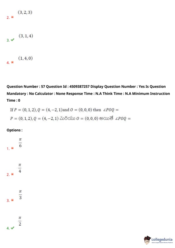 If \( P = (0,1,2) \), \( Q = (4,-2,-1) \) and \( O = (0,0,0) \), then \( \angle POQ \) is: