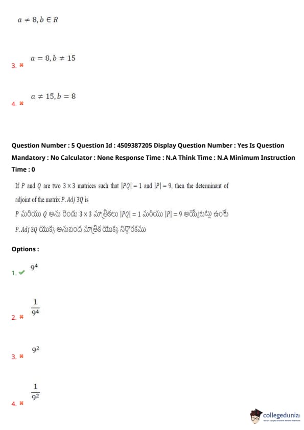 If \( P \) and \( Q \) are two \( 3 \times 3 \) matrices such that \( |PQ| = 1 \) and \( |P| = 9 \), then the determinant of adjoint of the matrix \( P . Adj \ 3Q \) is: