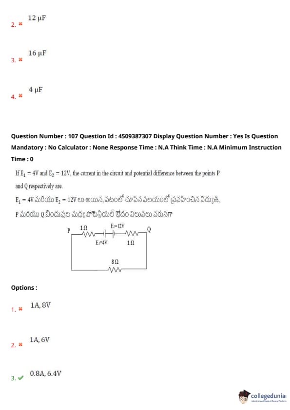 If \( E_1 = 4V \) and \( E_2 = 12V \), the current in the circuit and potential difference between the points P and Q respectively are: