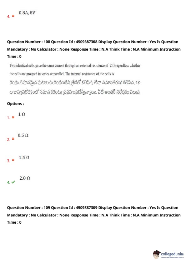 Two identical cells gave the same current through an external resistance of \( 2 \)\(\omega\) regardless of whether the cells are grouped in series or parallel. The internal resistance of the cells is:
