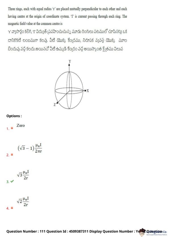 Three rings, each with equal radius \( r \), are placed mutually perpendicular to each other and each having centre at the origin of the coordinate system. If \( I \) is the current passing through each ring, the magnetic field value at the common centre is: