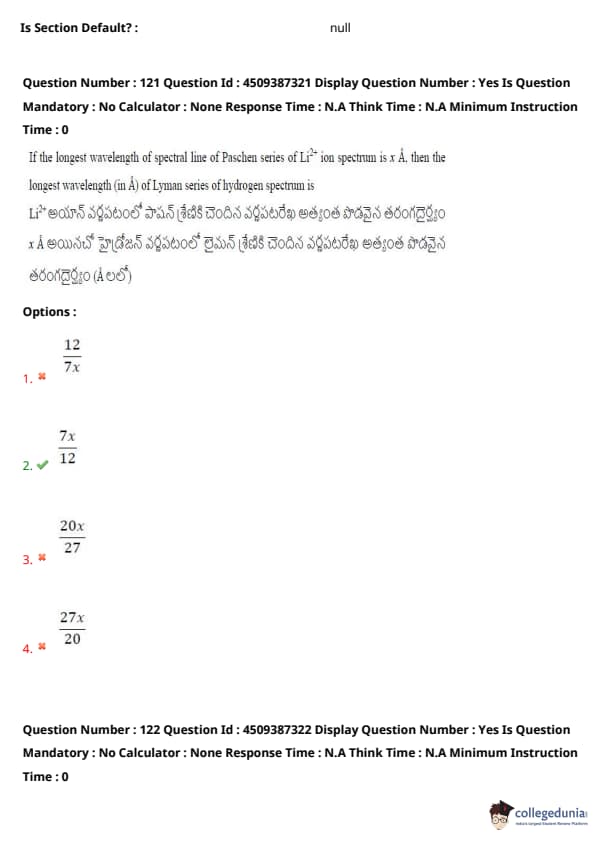 If the longest wavelength of the spectral line of the Paschen series of \( Li^{2+} \) ion spectrum is \( x \) Å, then the longest wavelength (in Å) of the Lyman series of the hydrogen spectrum is: