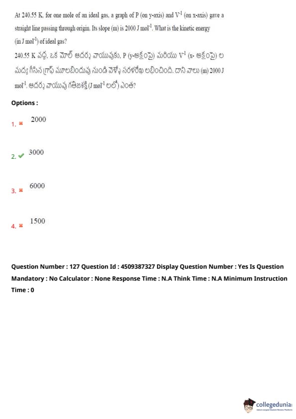 At 240.55 K, for one mole of an ideal gas, a graph of \( P \) (on y-axis) and \( V^{-1} \) (on x-axis) gave a straight line passing through the origin. Its slope (m) is 2000 J mol\(^{-1}\). What is the kinetic energy (in J mol\(^{-1}\)) of the ideal gas?