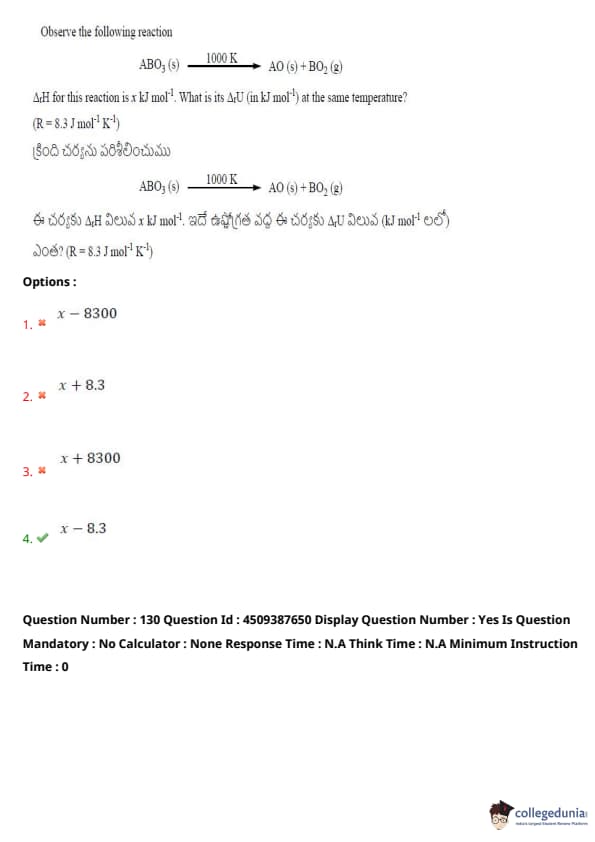 The enthalpy change \( \Delta H \) for this reaction is \( x \) kJ mol\(^{-1} \). What is its \( \Delta U \) (in kJ mol\(^{-1}\)) at the same temperature?